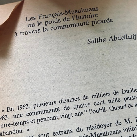Je suis arrivée en Picardie à onze ans. On était partis avec la tribu. L’équivalent de trois villages. Mon père a été recasé comme interprète à la préfecture d’Amiens, au service des rapatriés. Puis on lui a proposé Versailles. Il a dit non. On est restés en Picardie. Il a été au chômage six mois. Il nous a rien ditet allait tous les jours à la préfecture. Jusqu’à ce qu’ils le recasent au bureau du courrier. En suite il a travaillé à la Région.